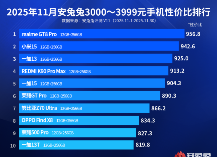 今天给环球保举一款三千档价位上,性价比排名第1的旗舰手机,来自realme的真我GT8Pro,realme是OPPO扶执的子品牌,这款真我GT8Pro在安兔兔最新的手机性价比名次榜中,3000王人按3999元价位上,蹂躏打败小米,红米,iQOO,一加等品牌的机型,拿劣等1名。