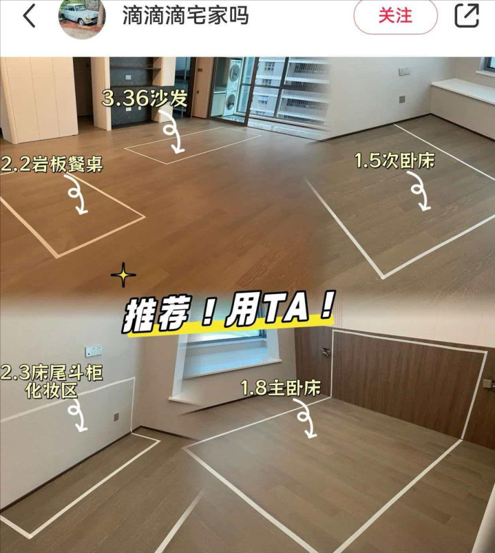提前用好意思纹纸省略庸碌纸壳板在地上模拟床等摆放后的位置,然后测试与附进产品使用是否打架;同期测量床头左右插座、开关位置,在遴荐床头造型时,带着尺寸去挑。