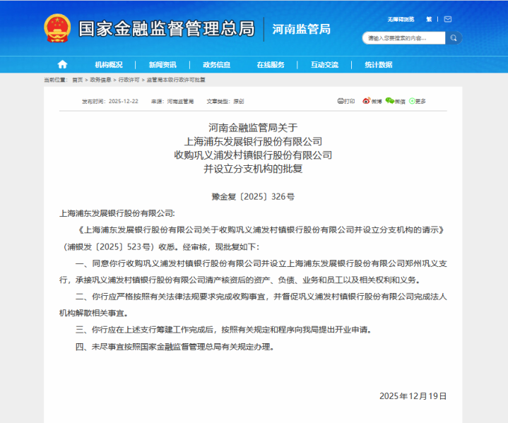 12月22日,国度金融监督经管总局河南监管局发布批复,甘愿浦发银行收购巩义浦发村镇银行并开垦郑州巩义支行。这家接济于2009年、注册成本1.5亿元的村镇银即将告别孤苦法东谈主身份,一皆金钱、欠债、业务及职工被纳入浦发银行和洽经管框架。
